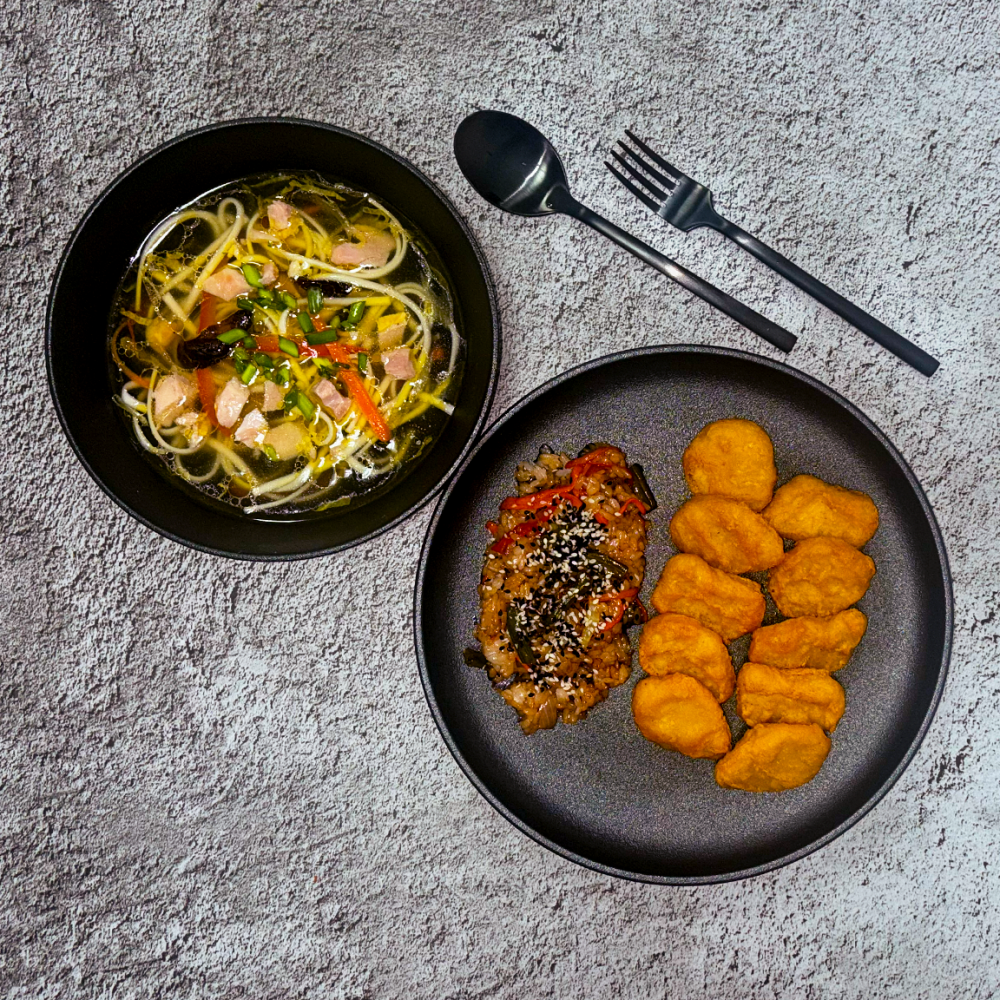 Суп куриный с грибами, Рис с овощами, Наггетсы.