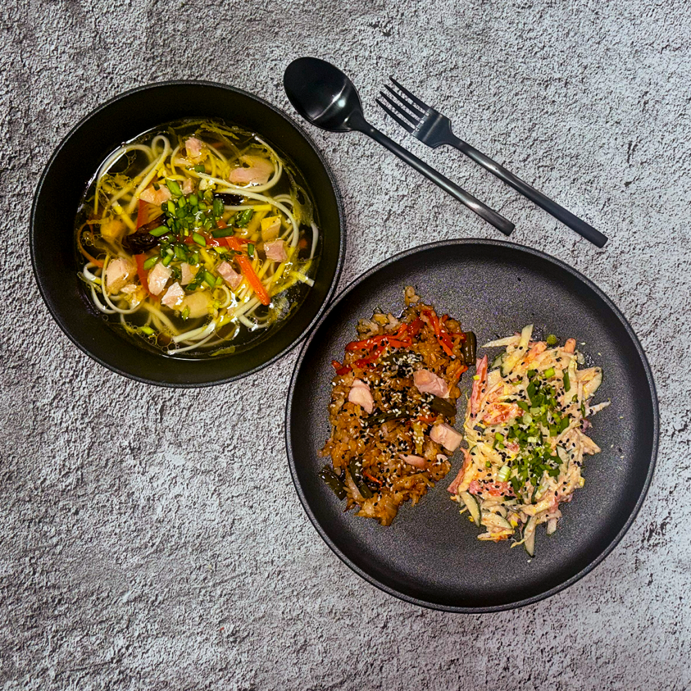 Суп куриный с грибами, Рис с курицей и овощами, Острый овощной салат (в составе соус шрирачи)