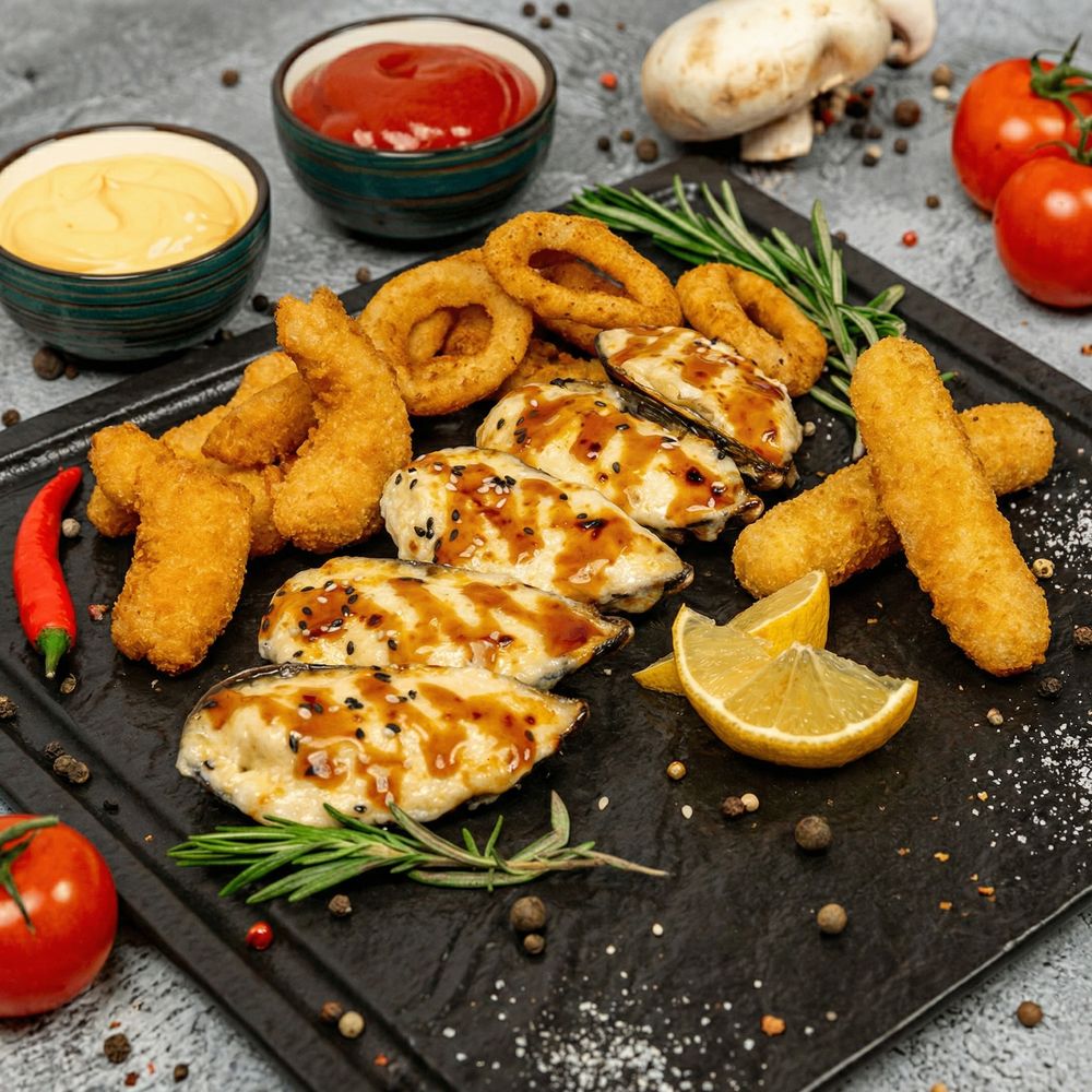 Эби темпура Кольца кальмара Запеченные мидии Сырные палочки