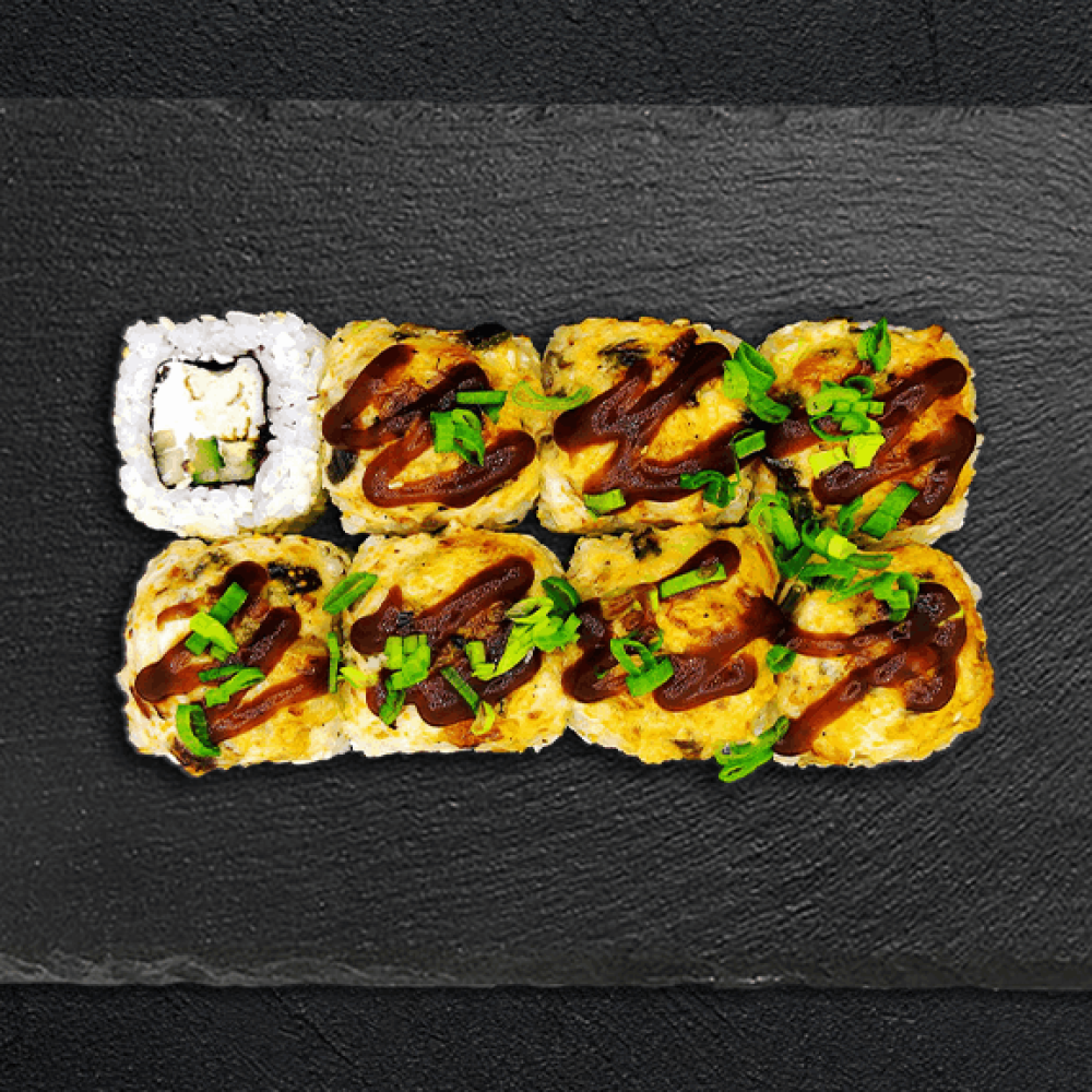 Состав: Рис , Нори, Сливочный Сыр, Крошка Чипсов, Омлет Томаго, Свежий Огурец, Лук Зеленый, Курица, Соус Спайс , Соус Унаги