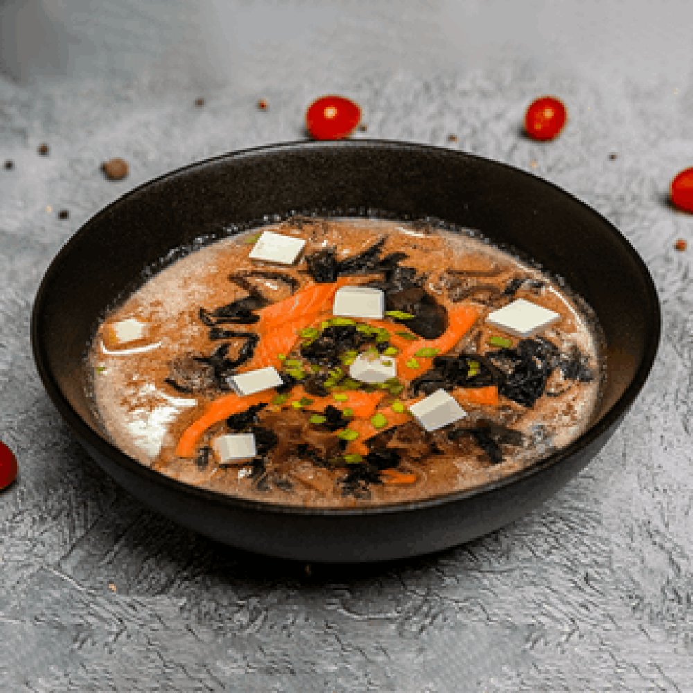 Классический японский суп на основе мисо-пасты, бульона хондаши, с грибами шиитаки, вакаме, брынзой фетаксой, зеленым луком и лососем