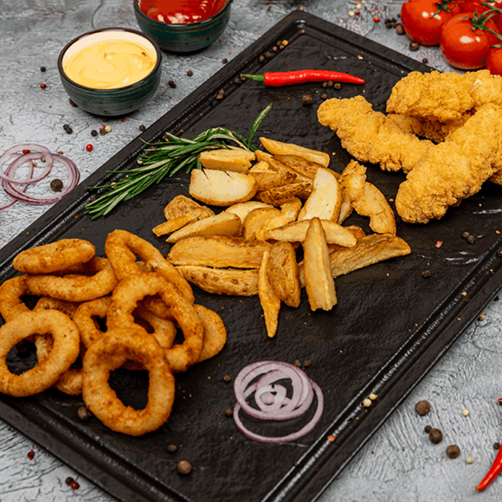 Луковые кольца Картофельные дольки Стрипсы